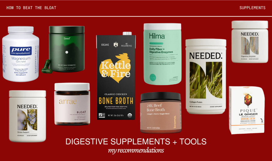 Occasional bloat supplements: Can be useful during travel, holidays, or high-fiber meals you struggle to digest. This is a support tool, not a crutch. Arrae’s popular boat supplement has a mix of organic botanicals like ginger, lemon balm, peppermint and more.